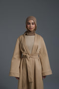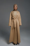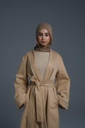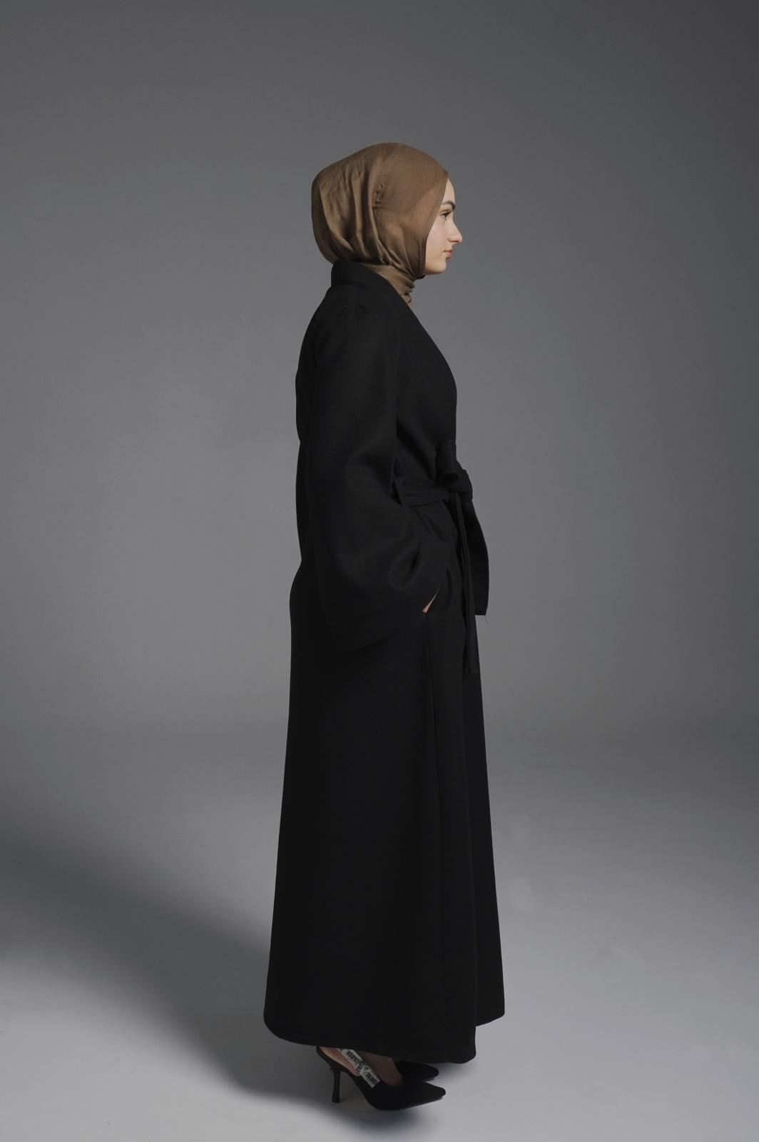 Elevate your outerwear with this minimalist belted abaya coat, designed to offer both warmth and sophistication. Crafted from high-quality wool-blend fabric, this full-length coat features a clean, structured silhouette with a soft drape, making it a versatile layering piece.