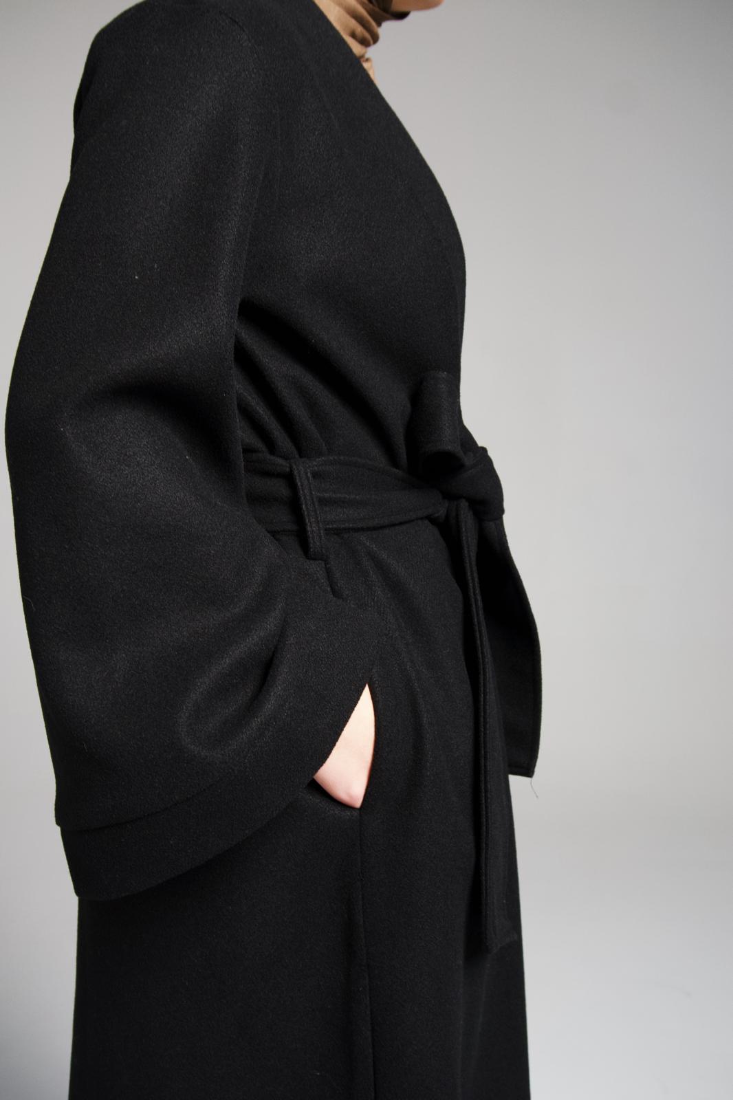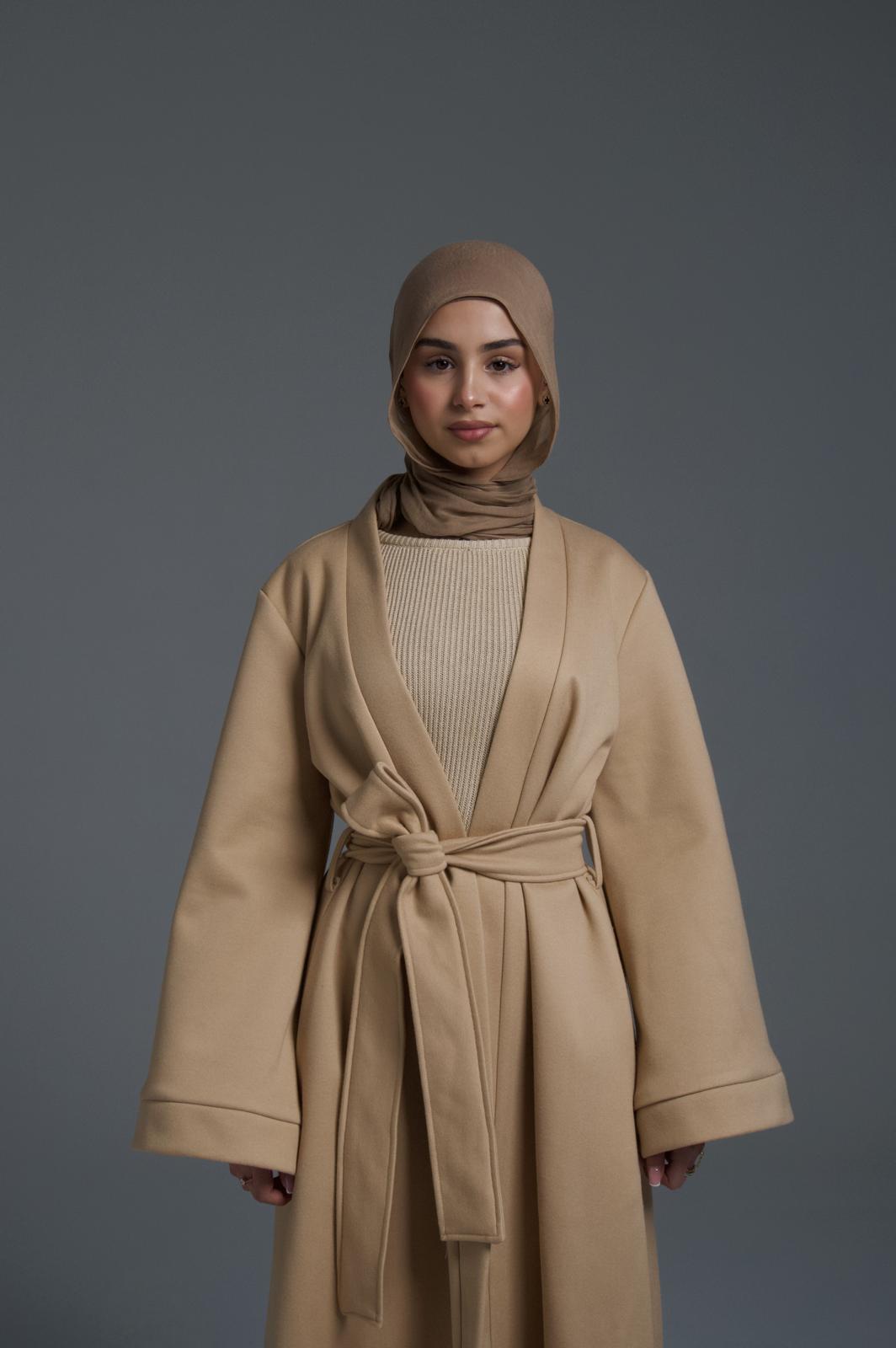 The wide sleeves and open front design are paired with a matching self-tie belt that cinches at the waist for a flattering, tailored fit. Whether worn open for a relaxed look or tied for definition, this coat effortlessly complements modest and contemporary wardrobes alike.